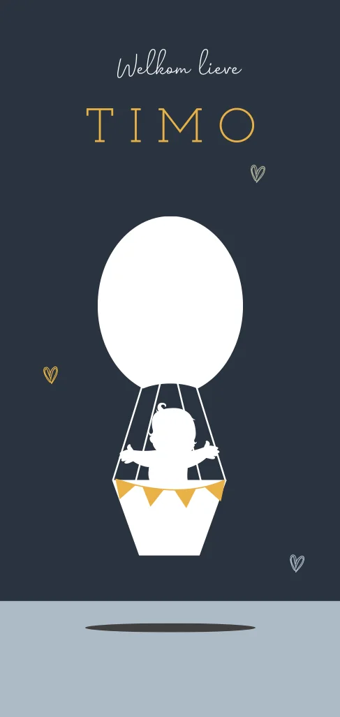 Trendy donkerblauw adoptiekaartje met silhouetje van een vrolijke jongen in een luchtballon. Het adoptiekaartje is versierd door gekleurde hartjes die rond de luchtballon zweven. De naam van jouw adoptiekindje staat in een hip lettertype. Is het kaartje helemaal naar wens? Bestel dan eerst een proefdruk!