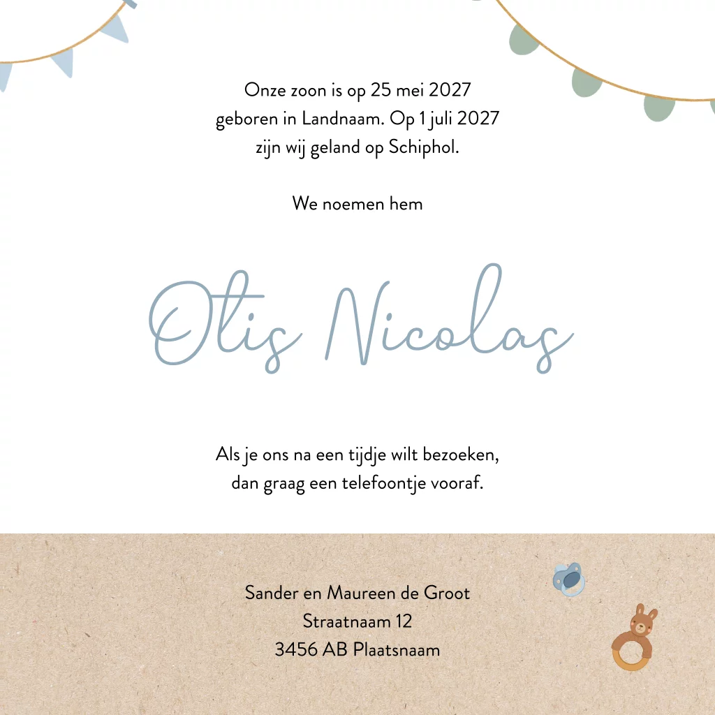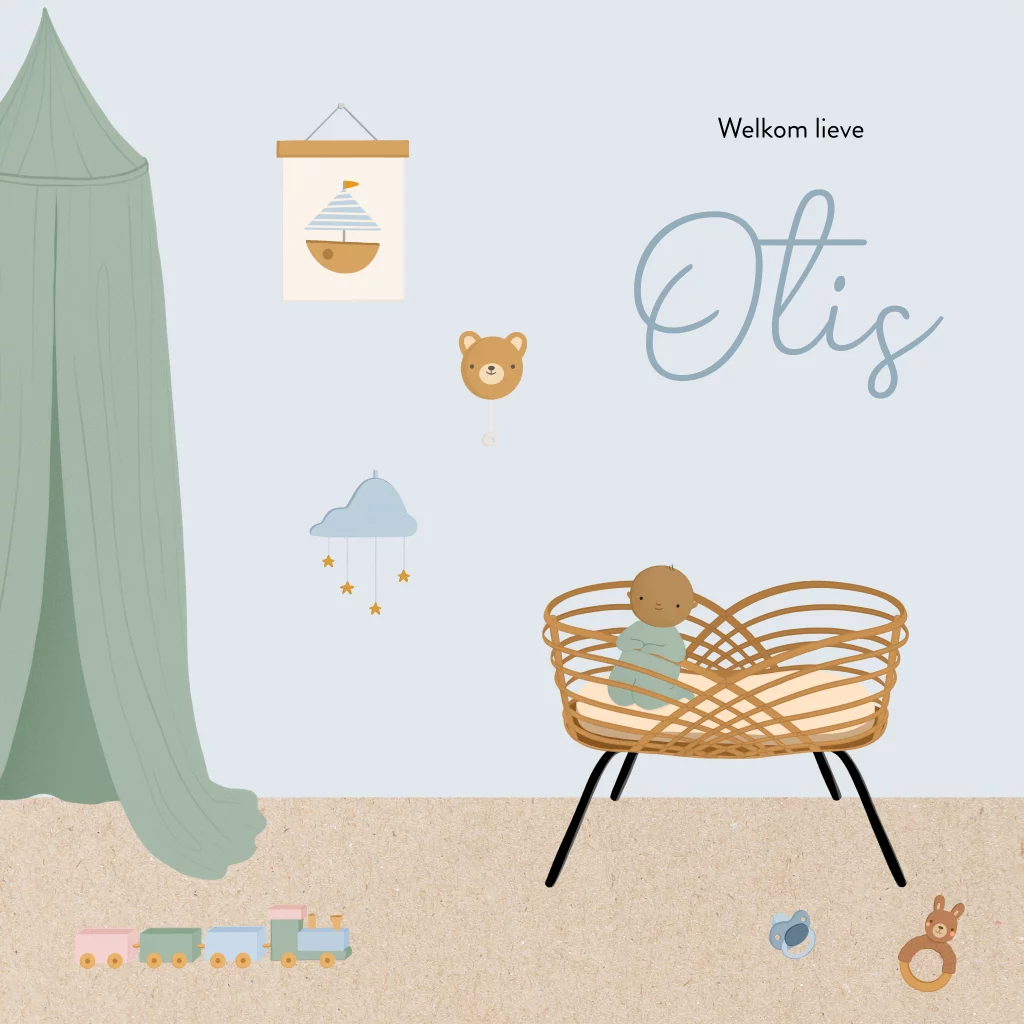 Een lief adoptiekaartje met een getekend kinderkamertje met wiegje en de baby, hemeltje en speelgoed. Met de tekeningen in onze ontwerptool kun je dit originele kaartje zelf aanpassen, bijvoorbeeld in de stijl van de babykamer van je kindje. Voeg bijvoorbeeld slingertjes, een plankje of kleertjes toe of verschuif de huidige afbeeldingen. Aan de binnenzijde van dit kaartje komen de illustraties terug. Klaar met spelen in onze ontwerptool en benieuwd naar het eindresultaat? Bestel een proefdruk.