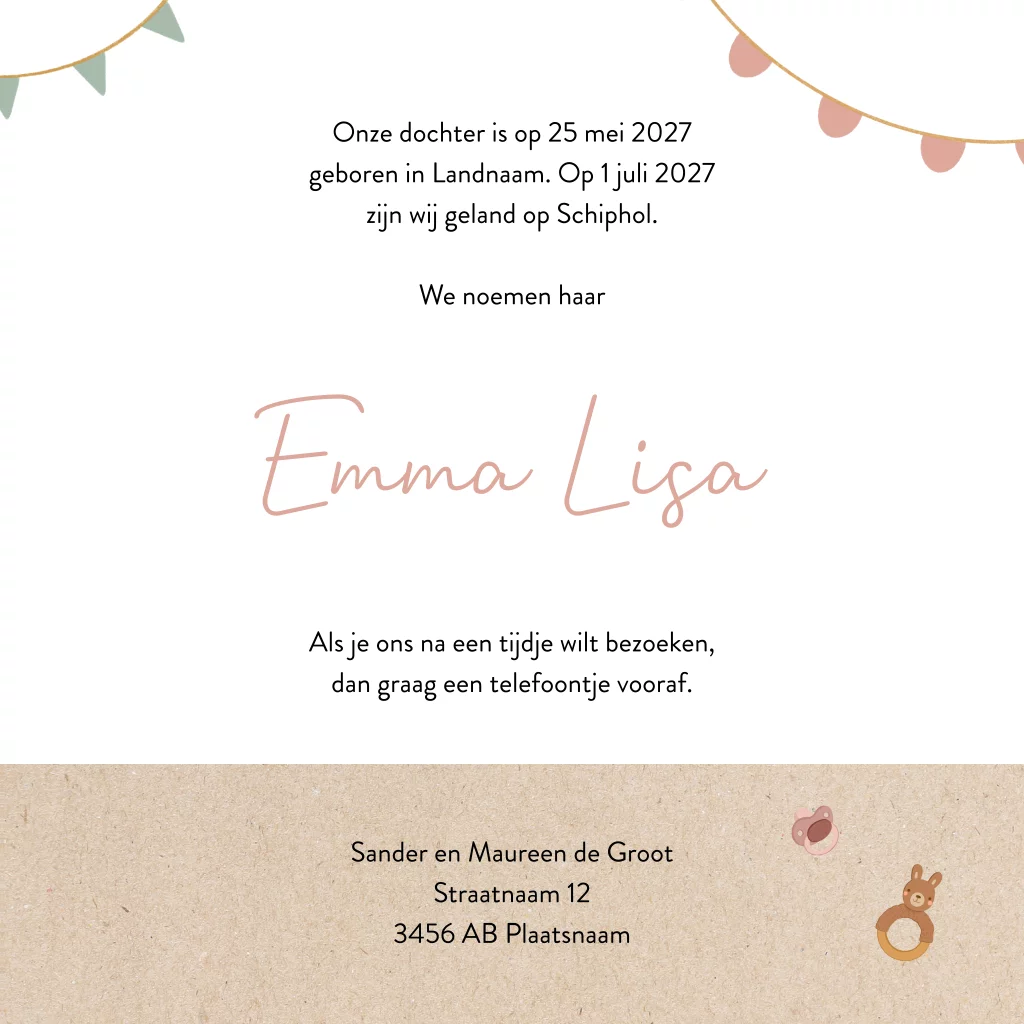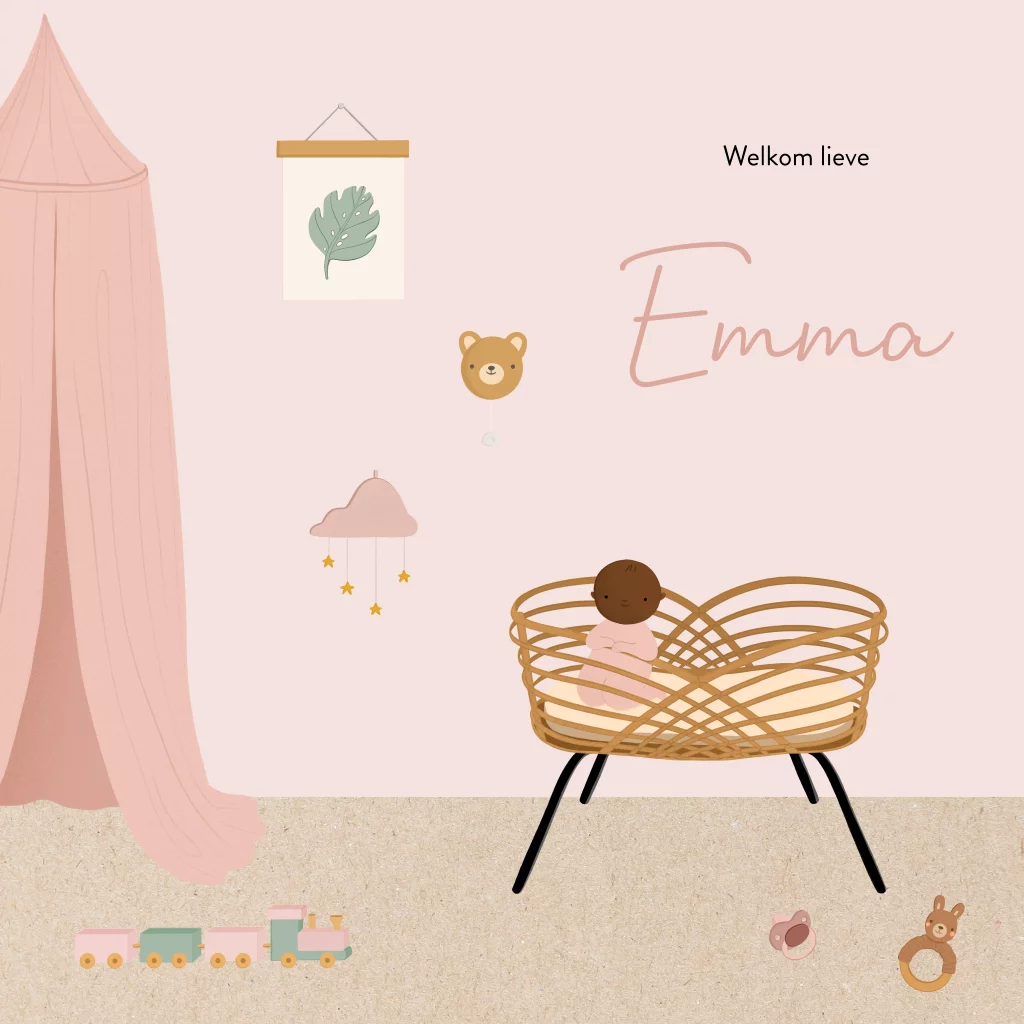 Adoptiekaartje met getekend kinderkamertje met wiegje en een donker baby meisje. Het wiegje is omgeven door een roze hemeltje en allerlei speelgoed. Met de tekeningen in onze ontwerptool kun je dit lieve kaartje zelf aanpassen, bijvoorbeeld in de stijl van hoe je de babykamer hebt ingericht. Je kunt ook eenvoudig de huidskleur van de baby aanpassen. Aan de binnenzijde van dit kaartje komen de tekeningetjes terug. Is het adoptiekaartje helemaal naar wens en wil je deze een keer in het echt zien? Bestel dan een drukproef.