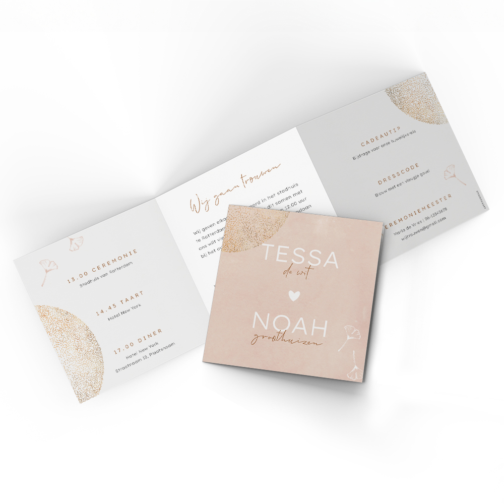 Drieluik trouwkaart met roze waterverf, stijlvolle typografie en Japans ginkgo blad. Zijn jullie op zoek naar een romantische trouwkaart? Kies dan voor dit zachtroze ontwerp met stijlvolle en sierlijke typografie. De kaart is op drieluik formaat, hierdoor heb je extra veel ruimte voor persoonlijke informatie, zoals een foto, een passend gedichtje en het dagprogramma. De illustraties van het Japanse Ginkgo blad maken het ontwerp tot een mooi geheel. Nieuwsgierig, bestel een proefdruk om de kaart in het echt te bekijken.