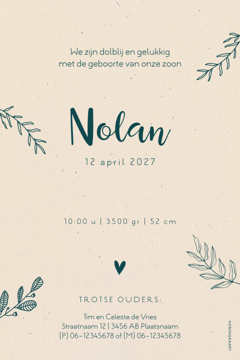 Botanisch geboortekaartje voor jouw pasgeboren zoontje met een kader van takjes in donkergroen.