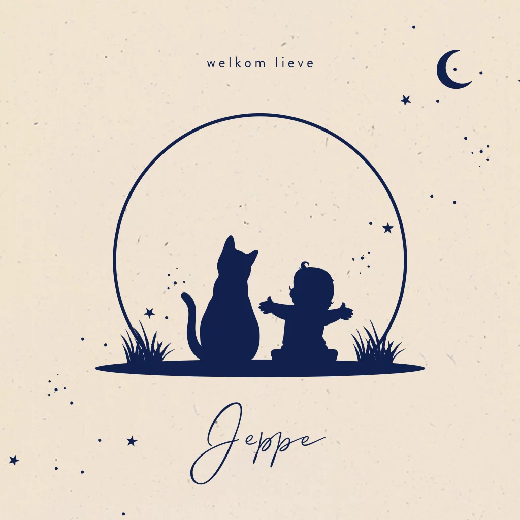 Duurzaam geboortekaartje met silhouet van een baby jongen met een lieve kat kijkend naar de zonsondergang. De maan komt al op en de sterren zijn al zichtbaar. De achtergrond is een wat gelere papiersoort met ecolook.