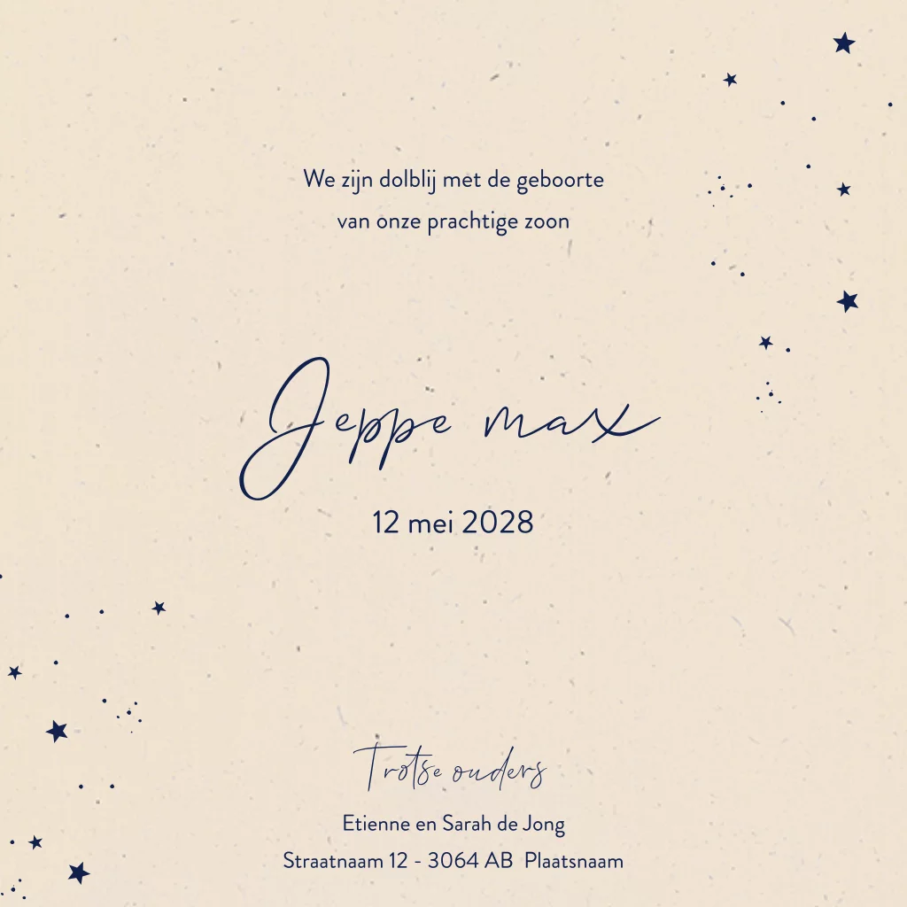 Dit geboortekaartje wordt gedrukt op eco papier, met keuze uit twee soorten. In dit voorbeeld tonen we ons standaard eco papier circle. Bestel eerst een drukproef om het resultaat te beoordelen.