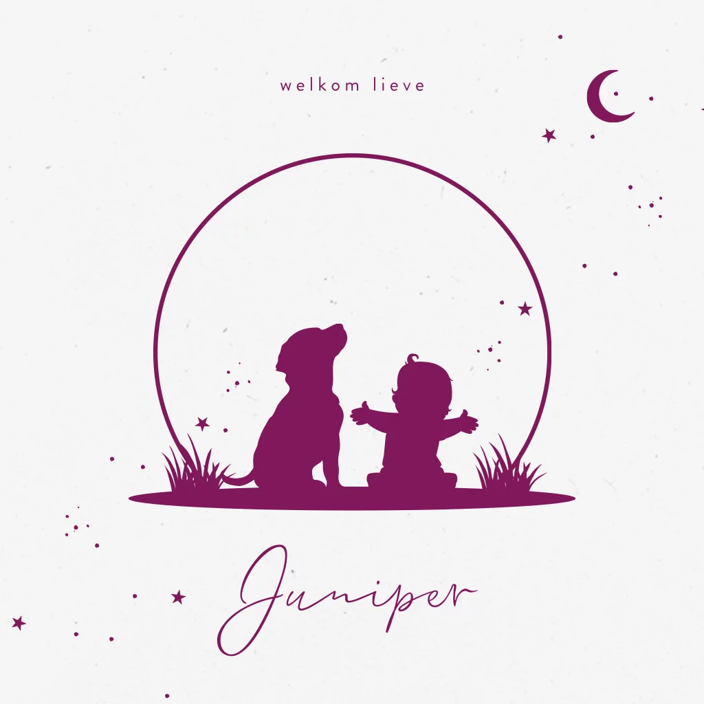 Duurzaam geboortekaartje met silhouet van een baby meisje met een lieve hond kijkend naar de zonsondergang. De maan komt al op en de sterren zijn al zichtbaar.