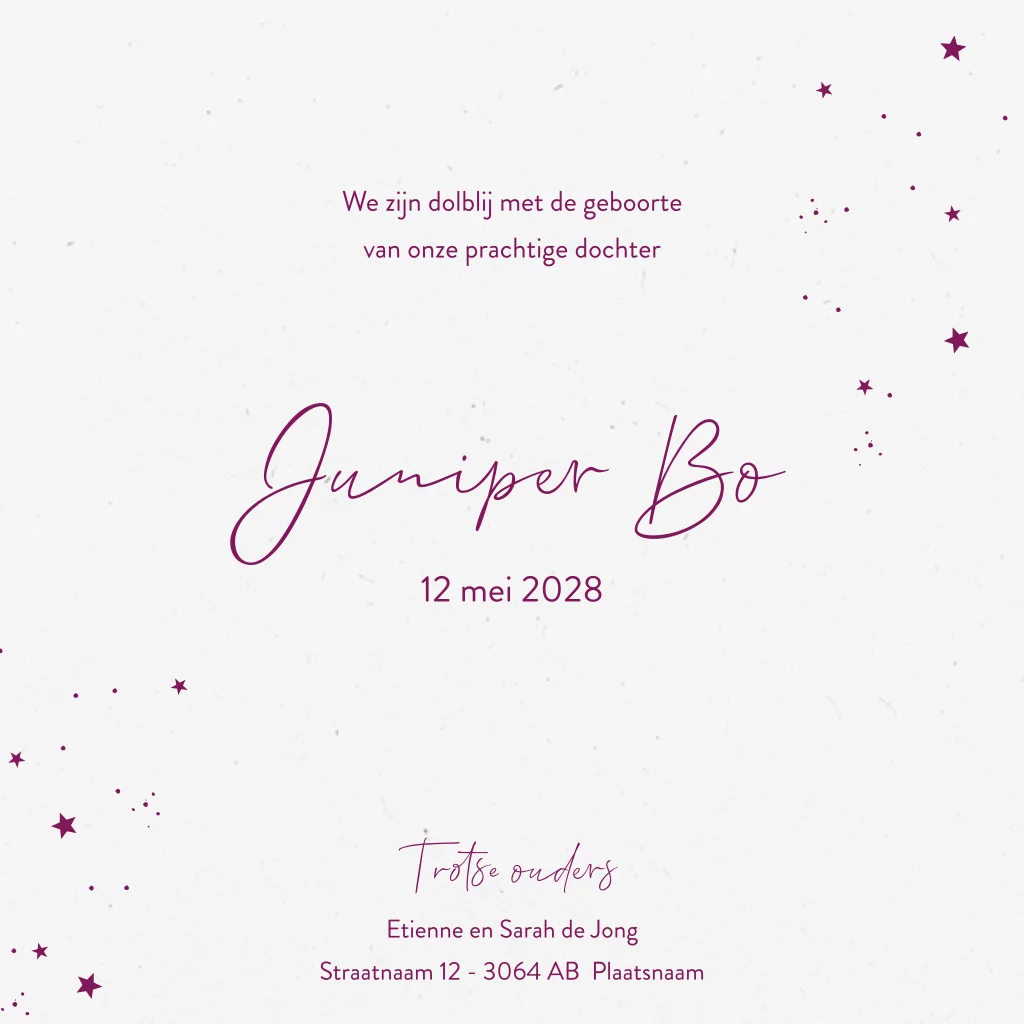 Dit geboortekaartje wordt gedrukt op eco papier, met keuze uit twee soorten. In dit voorbeeld tonen we ons standaard eco papier circle. Bestel eerst een drukproef om het resultaat te beoordelen.