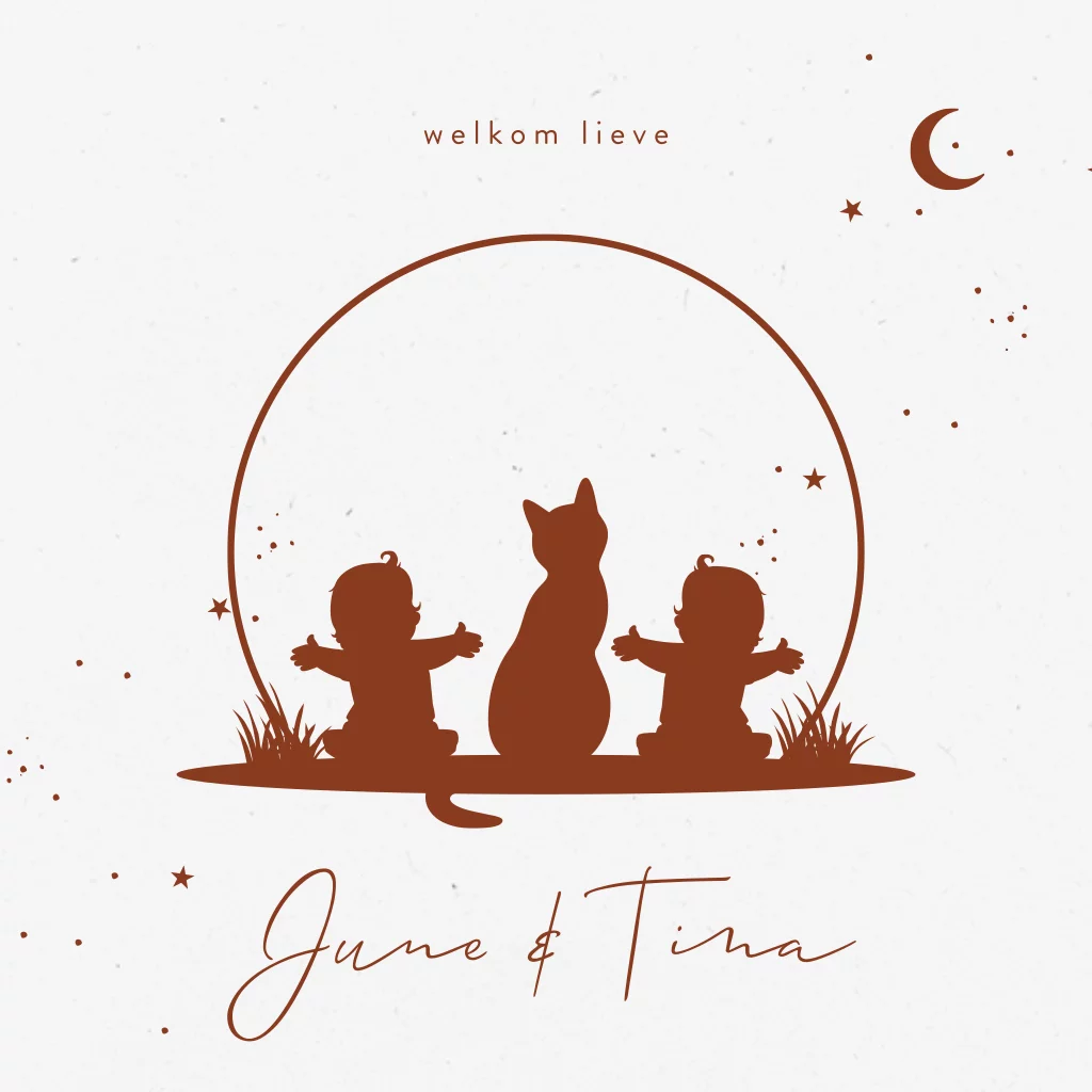 Duurzaam geboortekaartje silhouet tweeling meisjes en kat
