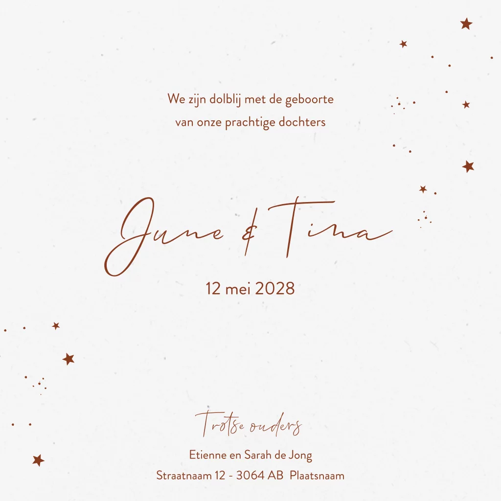 Dit geboortekaartje wordt gedrukt op eco papier, met keuze uit twee soorten. In dit voorbeeld tonen we ons standaard eco papier circle. Bestel eerst een drukproef om het resultaat te beoordelen.
