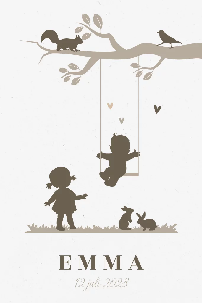 Een silhouet geboortekaartje, gedrukt in zachte beige tinten op duurzaam papier. Op dit prachtige kaartje zie je een grote zus liefdevol staan bij haar pasgeboren zusje op een schommel. Boven hen klimt een speelse eekhoorn langs de takken, terwijl schattige konijntjes vrolijk dartelen in het gras.