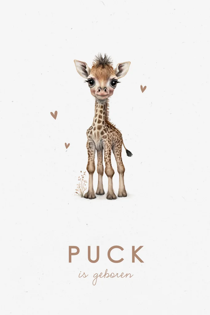 Wat een superschattig geboortekaartje met een baby giraffe met grote, lieve ogen en kleine hartjes eromheen. Genderneutraal kartje wat zowel voor een meisje als jongen een prima keuze is. Laat dit geboortekaartje op duurzaam papier drukken voor een extra zacht effect.