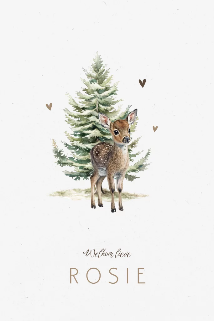 Lief unisex geboortekaartje gedrukt op eco papier met een illustratie van een lief hertje in het bos. je kunt dit geboortekaartje zowel voor een jongen als meisje kiezen, het is gender neutraal.