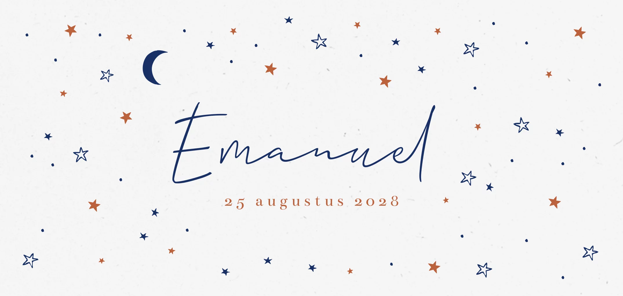 Liggend geboortekaartje met maantje en sterretjes in roestbruin en donkerblauw, gedrukt op recycle papier.