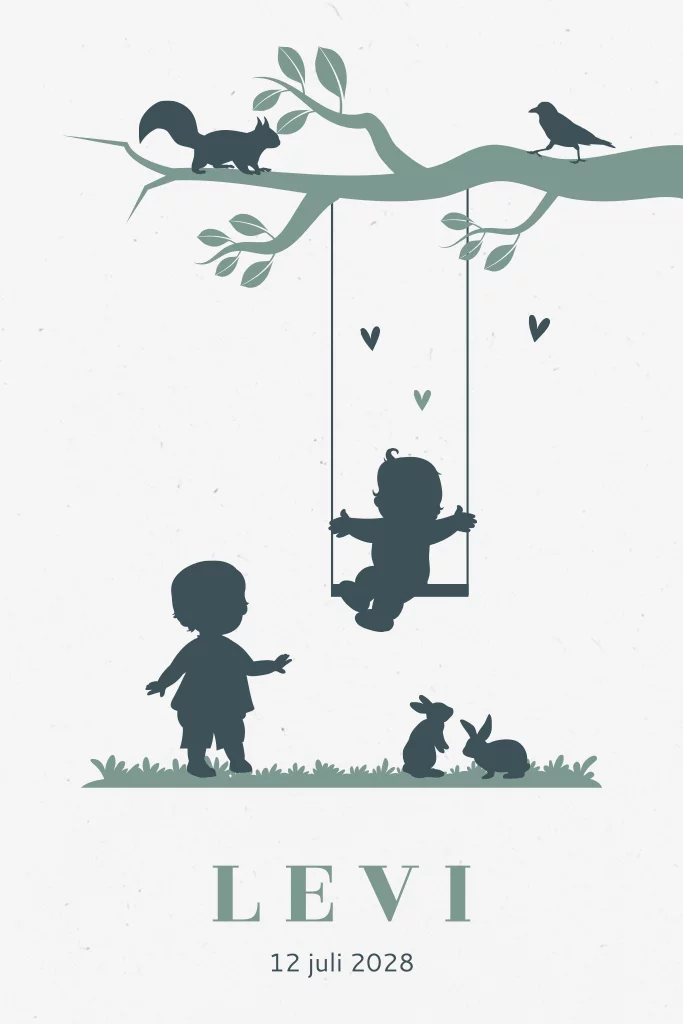 Een geboortekaartje op milieuvriendelijk papier, waarop een tafereel is afgebeeld met een grote broer die naast zijn pasgeboren kleine broertje staat bij een schommel. Boven hen beweegt een eekhoorn over de takken, terwijl vrolijke konijntjes zich vermaken in het gras.