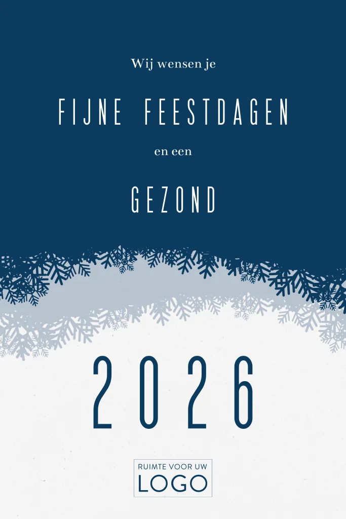 Een kerstgroet op een duurzame kerstkaart met afgeronde hoeken. De voorzijde is versierd met donkerblauwe ijssterren in twee verschillende tinten. Er is tevens ruimte beschikbaar voor uw logo onderaan de kaart.
