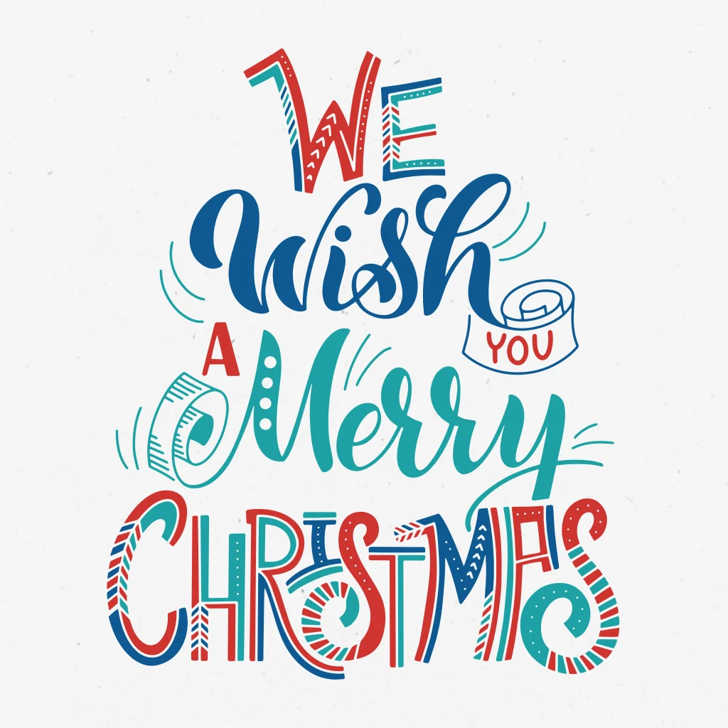 Een vrolijke kerstkaart met de wens "We wish you a merry Christmas," geschreven in een trendy typografie. Deze speciale boodschap is prachtig uitgevoerd in drie kleuren - groen, rood en aubergine, maar je kunt de kleuren naar wens aanpassen om de kaart nog persoonlijker te maken.
