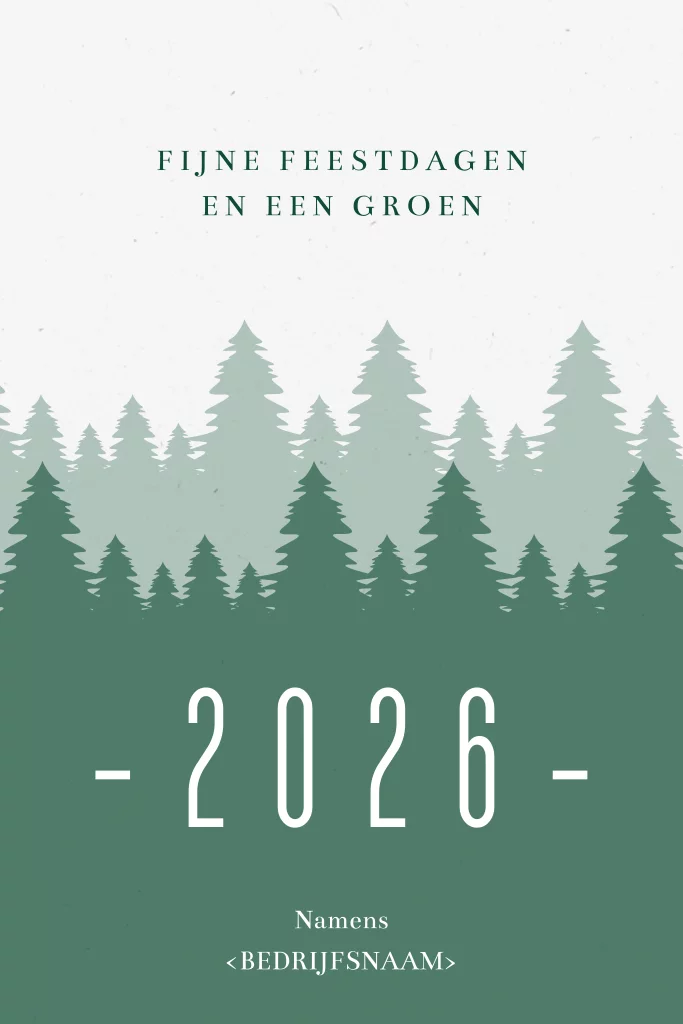 Enkele staande kerstkaart met ronde hoeken gedrukt op duurzaam papier. Voorop de kerstkaart staan groene kerstbomen en groot het jaartal 2026. Achterop is er ruimte voor uw logo. Pas de kaart naar eigen smaak aan.