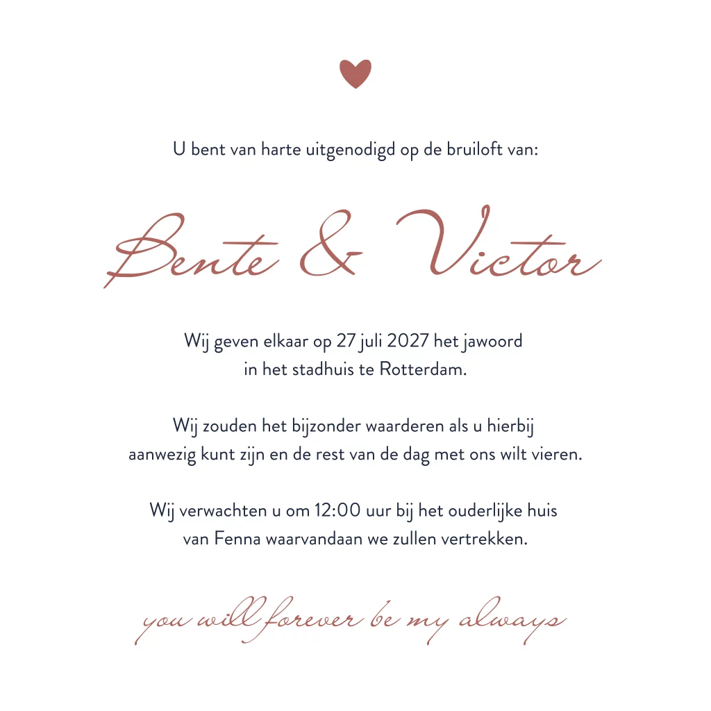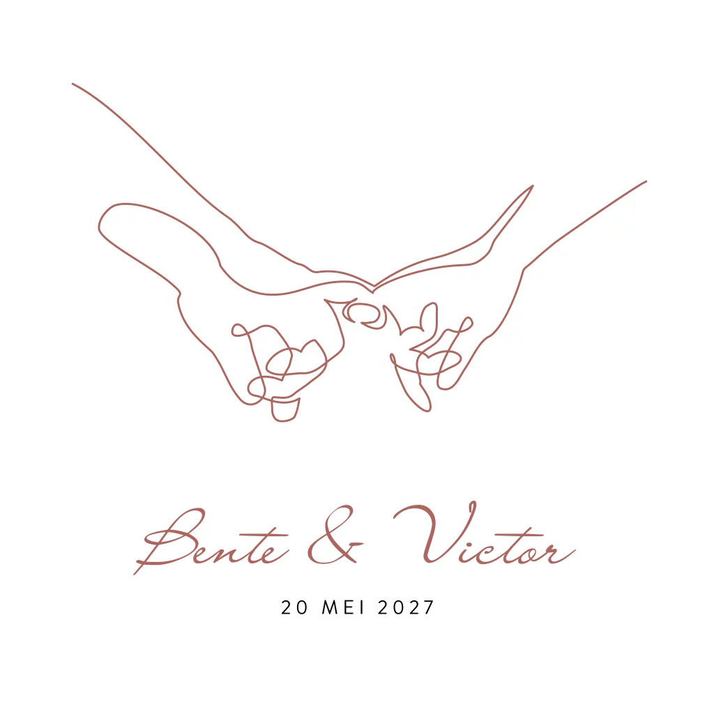 Duurzame trouwkaart met minimalistische lijntekening van handen. Deze trouwkaart, gedrukt op ecologisch papier, is eenvoudig en stijlvol. De moderne lijntekening van twee handen worden gedrukt in een mooie, bruine tint. Aan de binnenzijde van de kaart kun je alle informatie plaatsen over jullie trouwdag. Pas deze kaart gemakkelijk aan in onze handige ontwerptool door bijvoorbeeld een andere kleur voor de illustratie of lettertypes te kiezen.