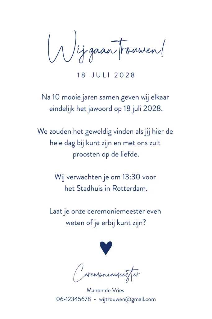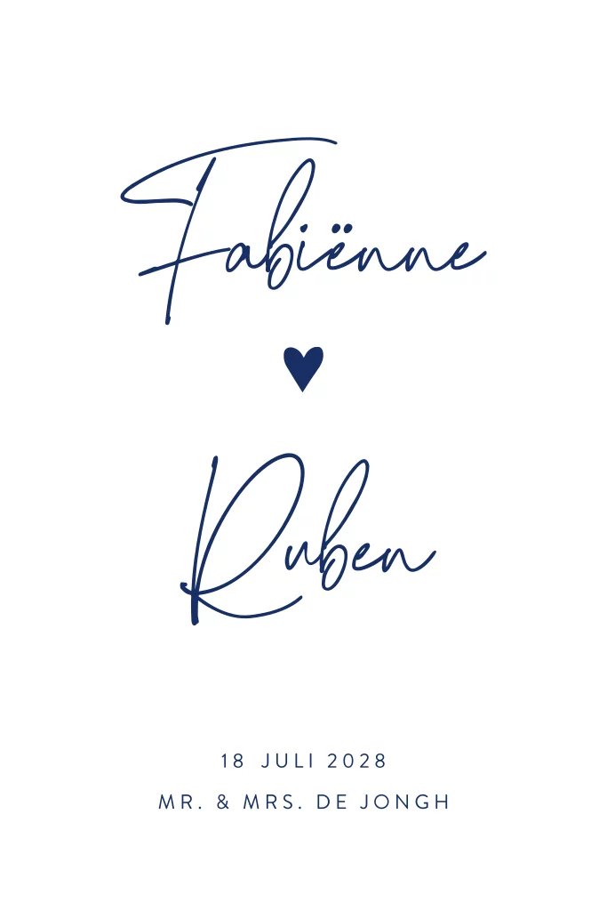 Less is more. Dat geldt bij deze stijlvolle trouwkaart, gedrukt op ecologisch papier. Deze kaart heeft namelijk niet veel meer nodig dan een prachtig lettertype voor jullie namen. In de kaart is ruimte voor het dagprogramma en de overige informatie. Blauw niet jouw kleur? Geen probleem, in de ontwerptool pas je de tekst helemaal naar wens aan.