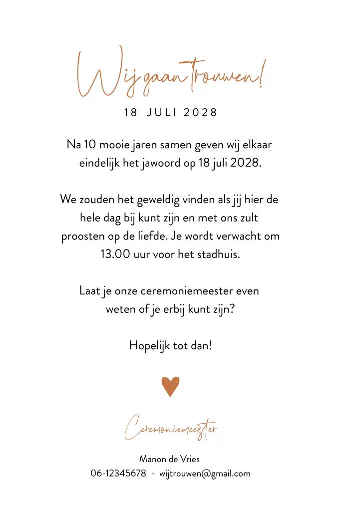 Een duurzame trouwkaart met roestbruine silhouetjes en typografie. Op de voorzijde staat een gezinnetje, deze kun je personaliseren door andere silhouetjes toe te voegen uit de map 'Silhouet familie' in onze editor. In de kaart is ruimte voor het dagprogramma en de overige informatie. Roestbruin niet jullie kleur? Geen probleem, in de ontwerptool pas je deze kaart helemaal naar wens aan.