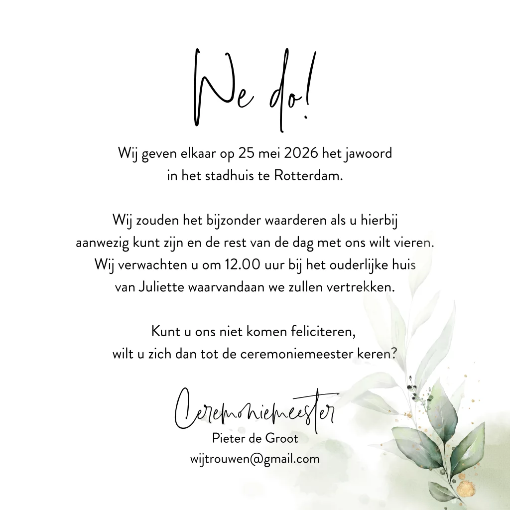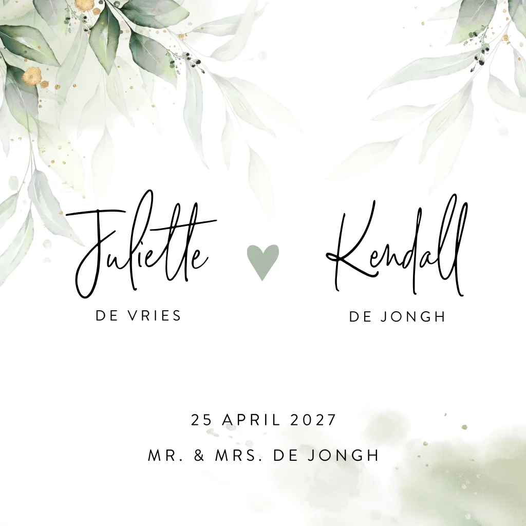 Botanische trouwkaart met waterverf bladeren en hartje, gedrukt op ecologisch papier. Op de voorkant staan jullie namen in een speelse letter, met daartussenin een groen hartje. De waterverf bladeren en vlekken maken van dit kaartje een dromerig geheel. Aan de binnenkant van de kaart komen de botanische elementen terug en kun je alle informatie over je bruiloft plaatsen.