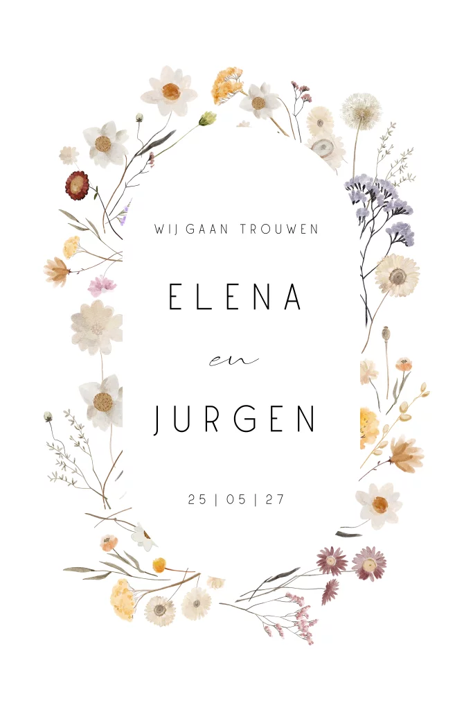 Stijlvolle, duurzame trouwkaart met een krans van kleine bloemetjes. In de bloemenkrans staan de namen van het bruidspaar. Je kunt deze kaart zelf bewerken in de editor en naar je eigen wens aanpassen.