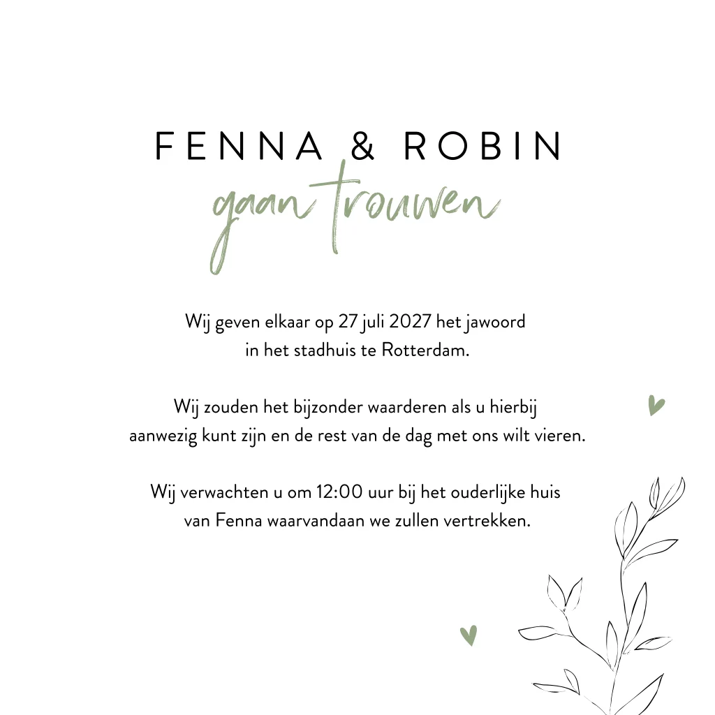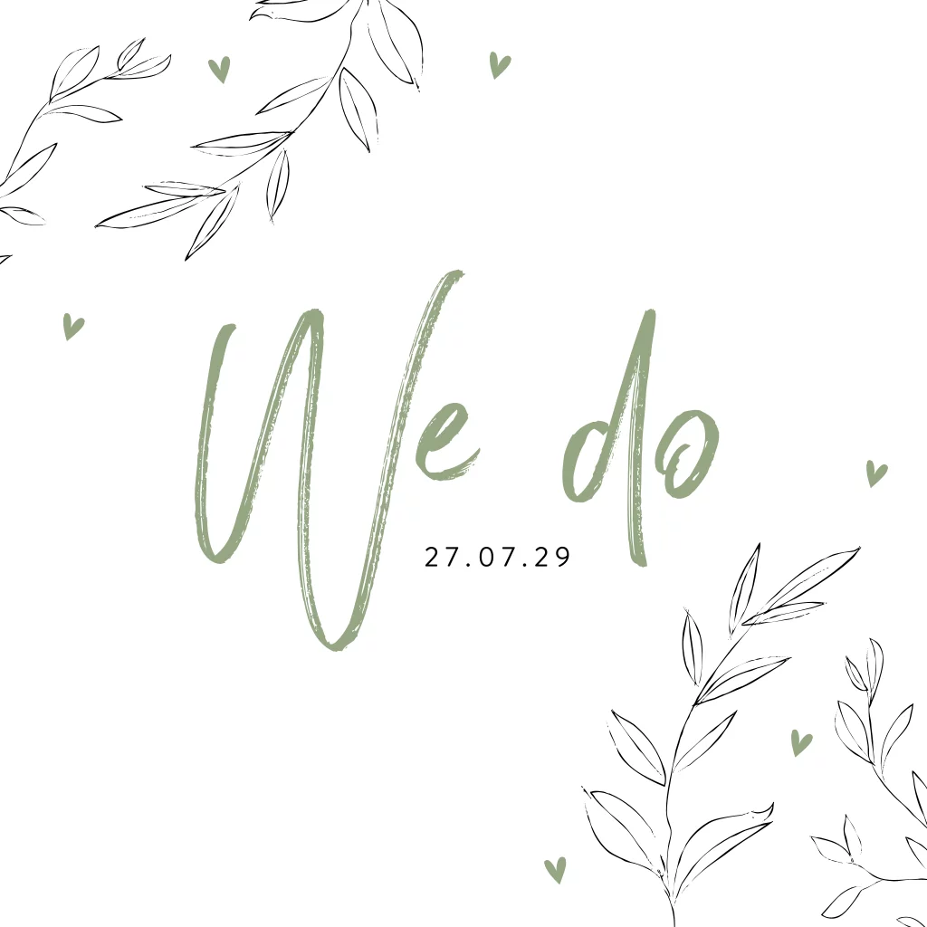 Trouwkaart met getekende blaadjes en We Do in groene typografie. Deze tijdloze trouwkaart wordt gedrukt op ecologisch papier. De groene typografie en blaadjes sluiten mooi aan bij dit duurzame ontwerp. Je kunt de kaart in de ontwerptool geheel naar wens aanpassen. Tevreden met je ontwerp? Bestel een drukproef.