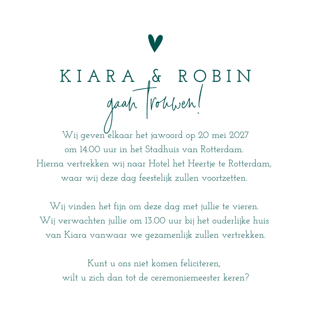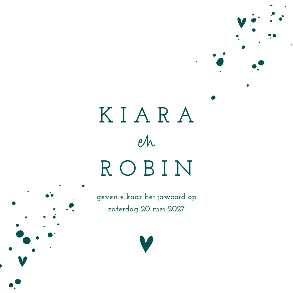 Duurzame trouwkaart met namen, spetters en hartjes in donkergroen. Ben jij op zoek naar een eco trouwkaart voor jullie huwelijk? Deze kaart wordt gedrukt op ecologisch papier. Jullie namen komen in een strak lettertype voorop, omringd door speelse spetters en hartjes. In de kaart is voldoende ruimte voor het dagprogramma en een persoonlijke boodschap. Pas het ontwerp naar wens aan in de ontwerptool.