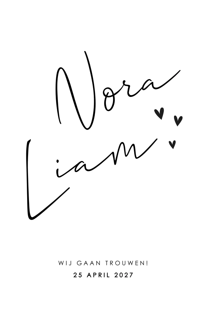 Op zoek naar een duurzame trouwkaart? Kies voor dit minimalistische ontwerp met de namen in een prachtig font in zwart gedrukt. Rond de namen staan hartjes om het geheel af te maken. Liever een andere kleur? Pas dit gemakkelijk aan in onze handige ontwerptool.