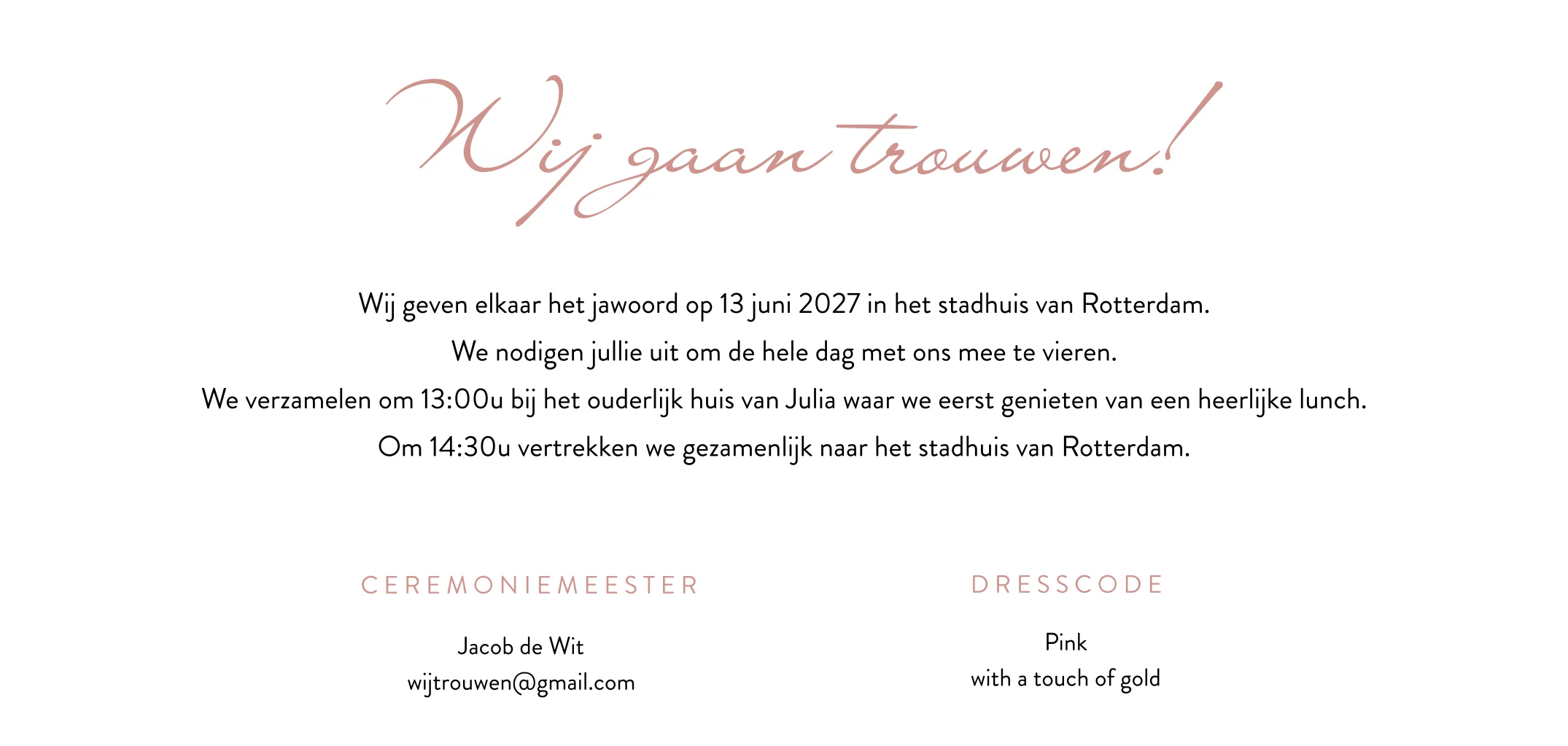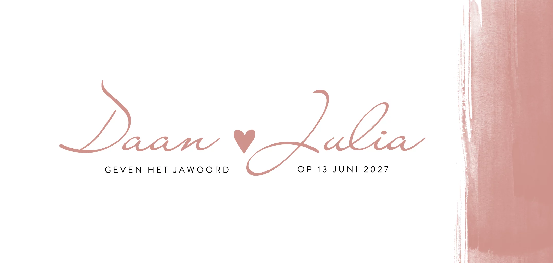 Een lieflijke, duurzame trouwkaart met roze waterverf veeg en hartjes. De speelse typografie en mooie roze kleur geven dit kaartje een lieve en romantische uitstraling. Aan de binnenkant van de kaart vind je een tijdlijn met leuke illustraties om je dag mee uit te stippelen. Pas deze tijdlijn en de rest van het ontwerp gemakkelijk aan in onze handige ontwerptool. Bestel gerust een proefkaartje met jullie eigen namen.