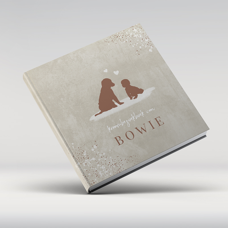 Beige kraambezoekboek met silhouet hond en kindje