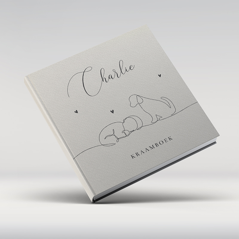 Vierkant kraamboek in beige met lijntekening van een slapende baby met hondje.