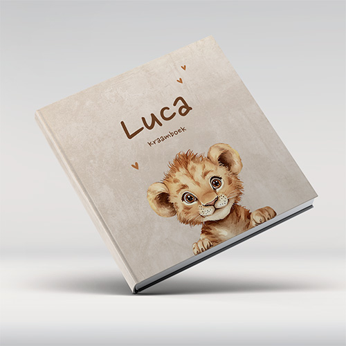 Kraamboek met een beige ontwerp met waterverf illustratie van een jong leeuwtje dat over het randje van de kaart kijkt.