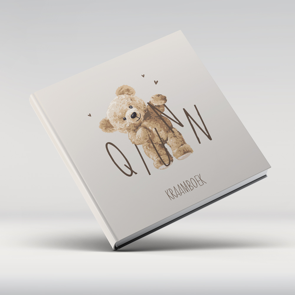 Beige kraamboek met lieve bruine teddybeer die de naam van je kindje vasthoudt. De arm en poot van de beer staan los zodat je de letters precies goed kunt positioneren.