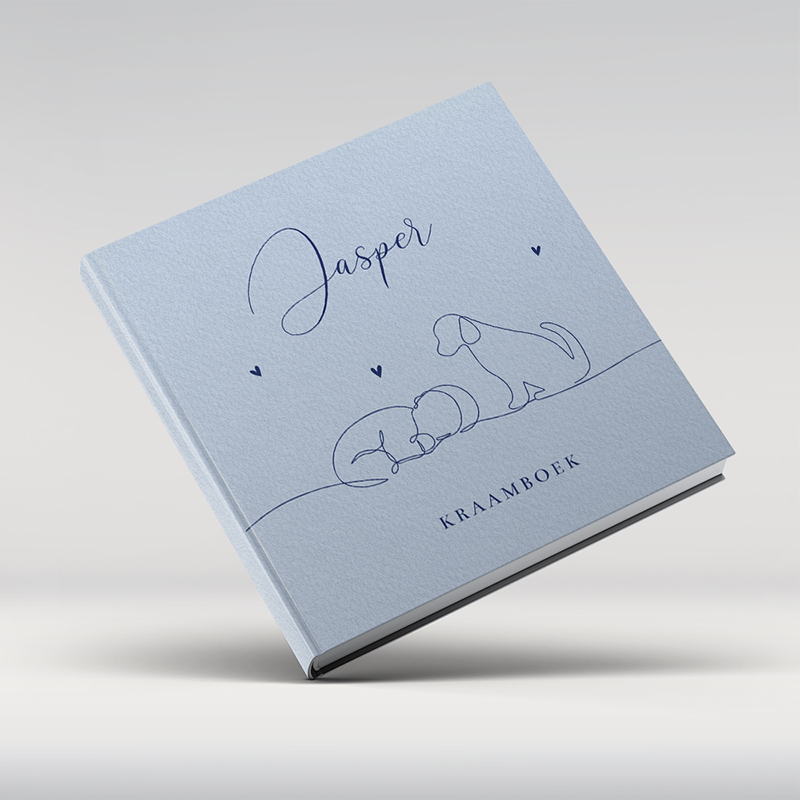 Vierkant kraamboek in blauwe met lijntekening van een slapende baby met hondje.