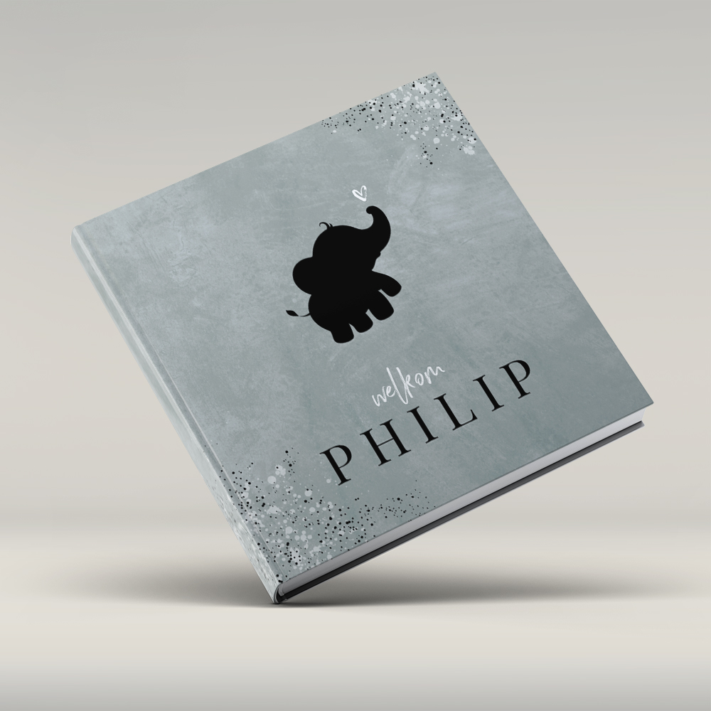 Kraambezoekboek in grijsblauwe kleur met lief zwart olifantje en spetters.
