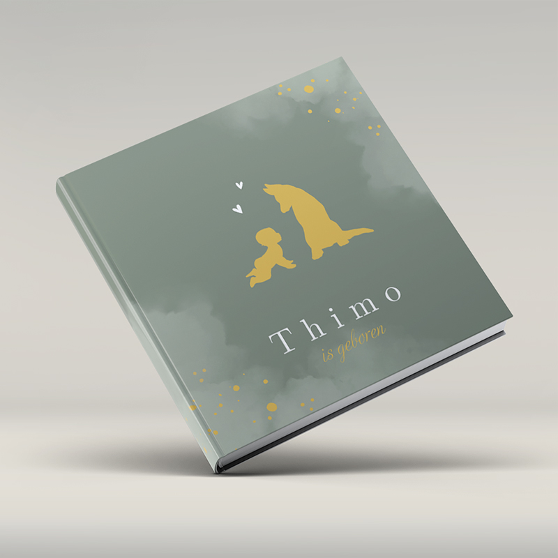 Lief groen kraambezoekboek met okergele baby met hond in silhouetjes (foliedruk niet mogelijk).