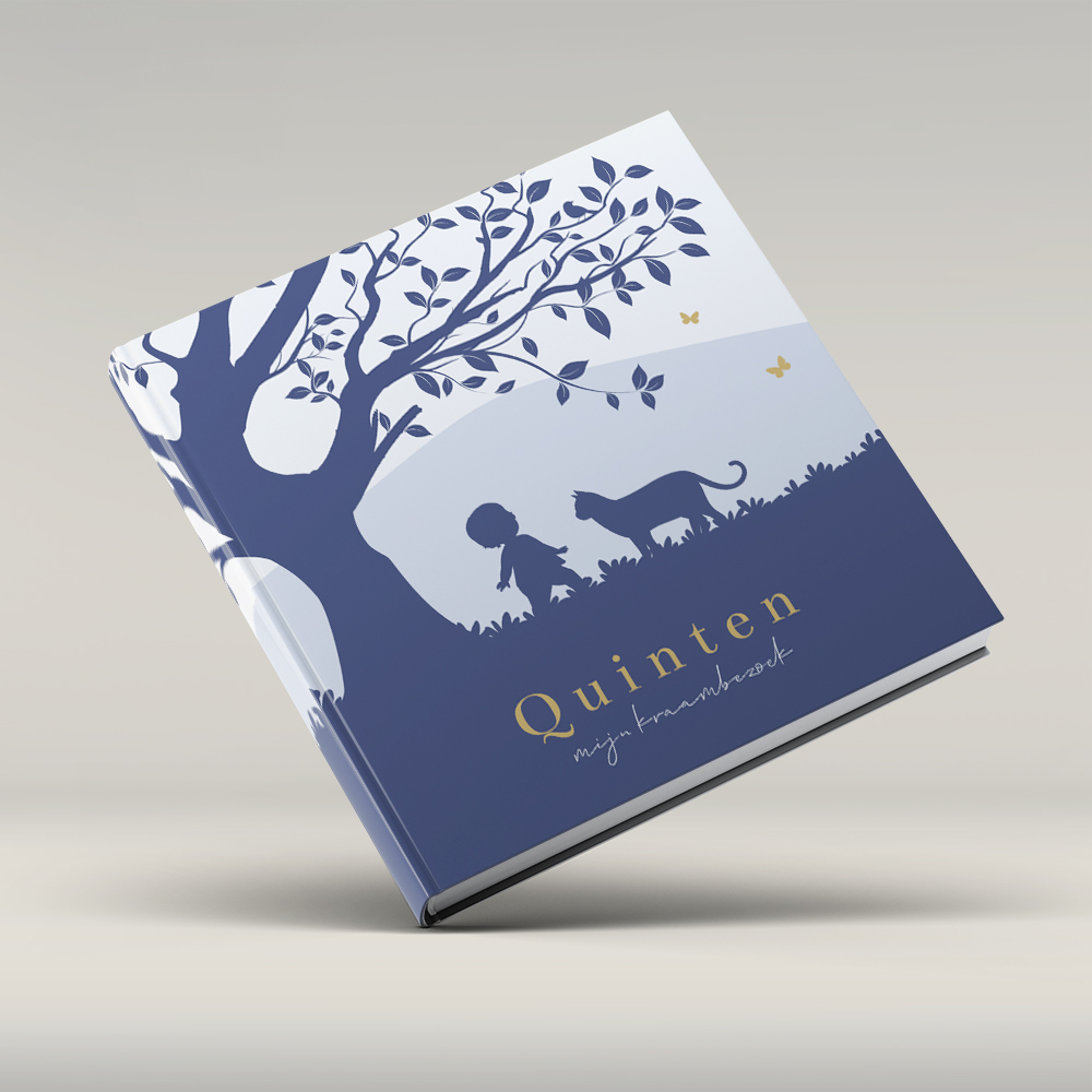 Blauw kraambezoekboek met silhouet jongetje en kat onder een grote boom.