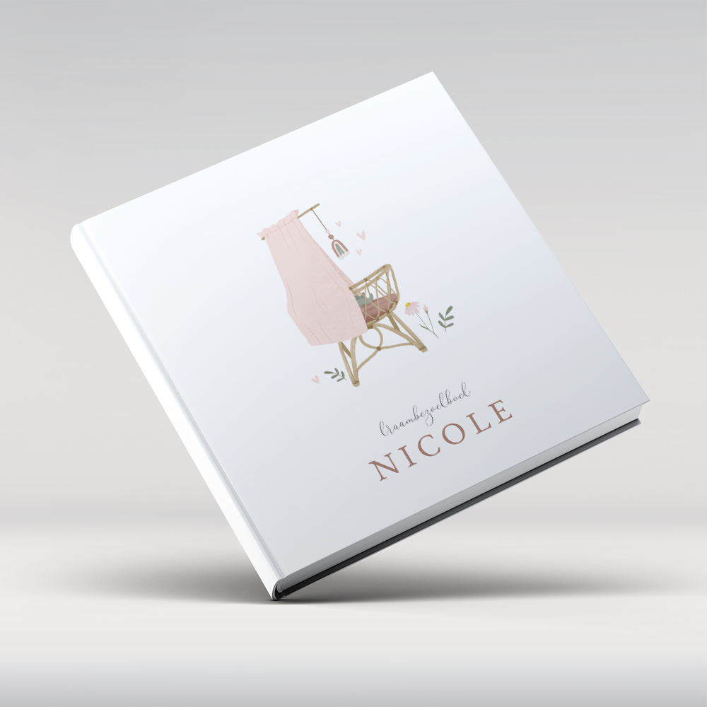 Klassiek kraamboek voor de geboorte van een meisje met roze wieg met bloemetjes.