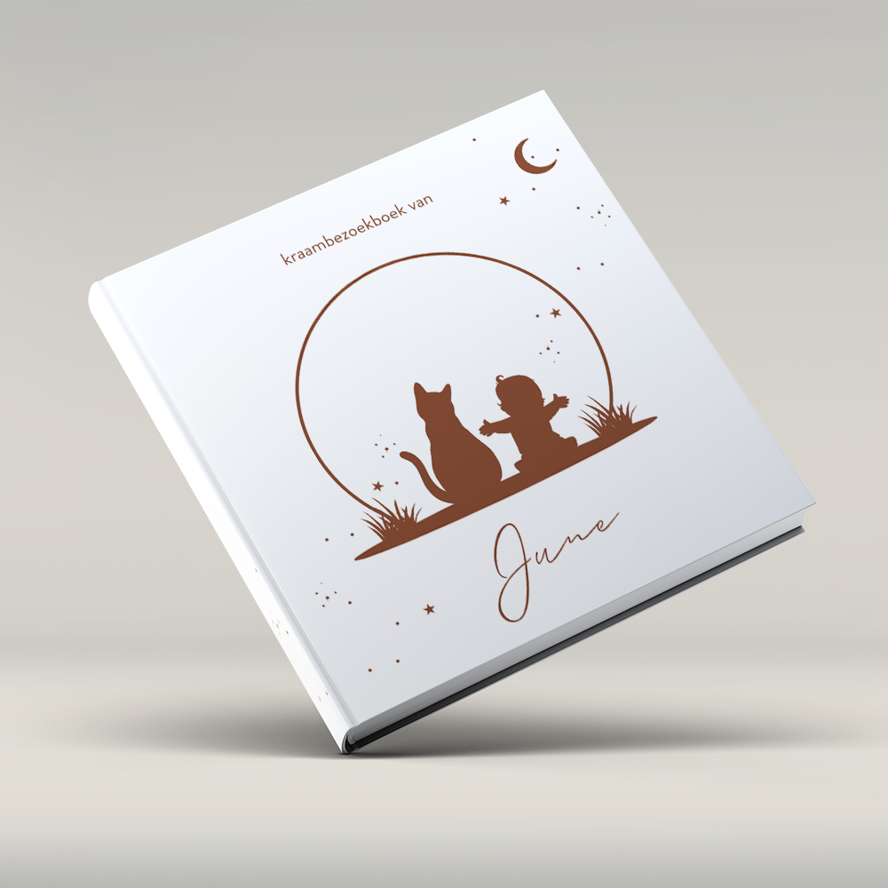 Wit kraambezoekboek met silhouet van een baby meisje met een lieve kat kijkend naar de zonsondergang.