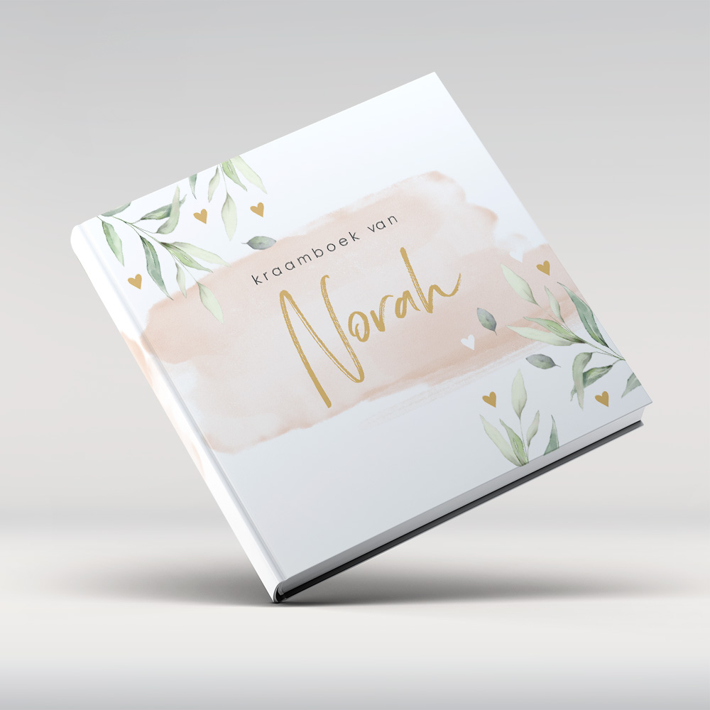 Kraambezoekboek met roze waterverf en groene blaadjes.