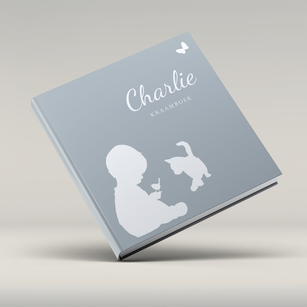 Blauw kraamboek met silhouet van een klein jongetje met vogeltje en kat die komt kijken.