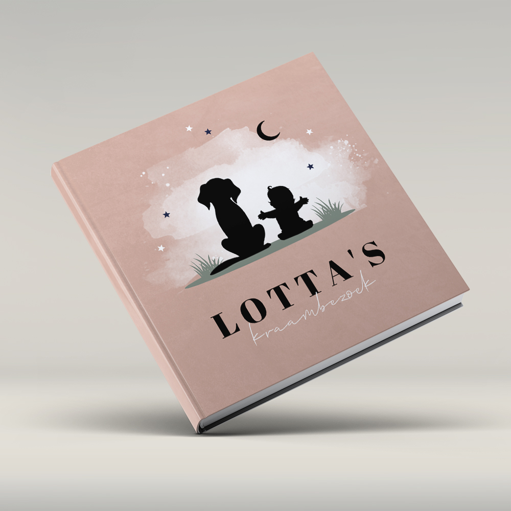 Roze kraambezoekboek met zwart silhouet van een baby meisje en hondje. Het boek wordt versierd met een maantje en sterretjes.