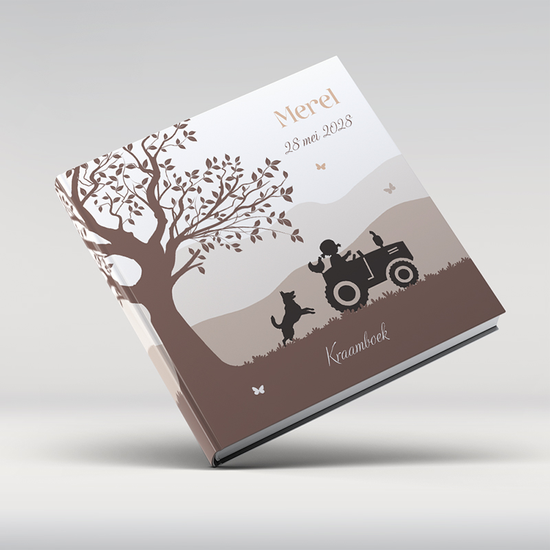 Vierkant kraamboek in roze met een silhouet van een tractor met een meisje achter het stuur.