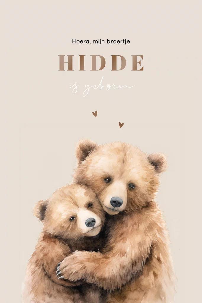 Verwachten jullie binnenkort jullie tweede kindje? Wat een fantastisch nieuws! Dit schattige geboortekaartje toont twee knuffelende beertjes tegen een zachte beige achtergrond. De naam van jullie pasgeboren zoontje zal in glanzend bruin gedrukt worden, waardoor het kaartje een extra speciale touch krijgt. Op de achterkant van het kaartje zal het beertje nogmaals te zien zijn, met ruimte om alle details over jullie kleine mannetje te delen. Dit kaartje is perfect om zijn komst aan te kondigen en om dit bijzondere moment met jullie te delen.