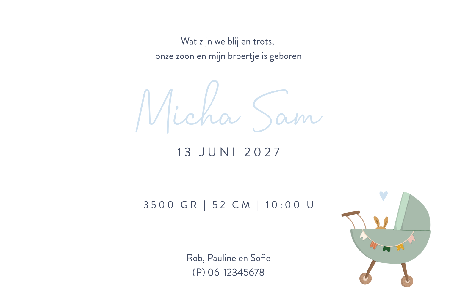 Een tweede kindje en dit keer een zoon, wat bijzonder! Kondig dit vrolijke nieuws aan met dit schattige geboortekaartje met twee getekende konijnen. Het oudere zusje duwt de kinderwagen met daarin haar baby broertje vooruit. Een vrolijk en schattig ontwerp, vind je ook niet? Bestel proefdruk om te kunnen zien hoe dit geboortekaartje er gedrukt uit komt te zien.