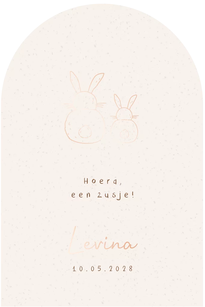 Speciaal voor de geboorte van jullie tweede kindje is dit charmante kaartje ontworpen. Twee lieve konijntjes staan centraal, een prachtig symbool voor jullie groeiende gezin. De zachte ecrutint in combinatie met roségoudfolie geeft het kaartje een zachte uitstraling, terwijl de afgeronde bovenzijde door de stans zorgt voor een speels en uniek ontwerp.
