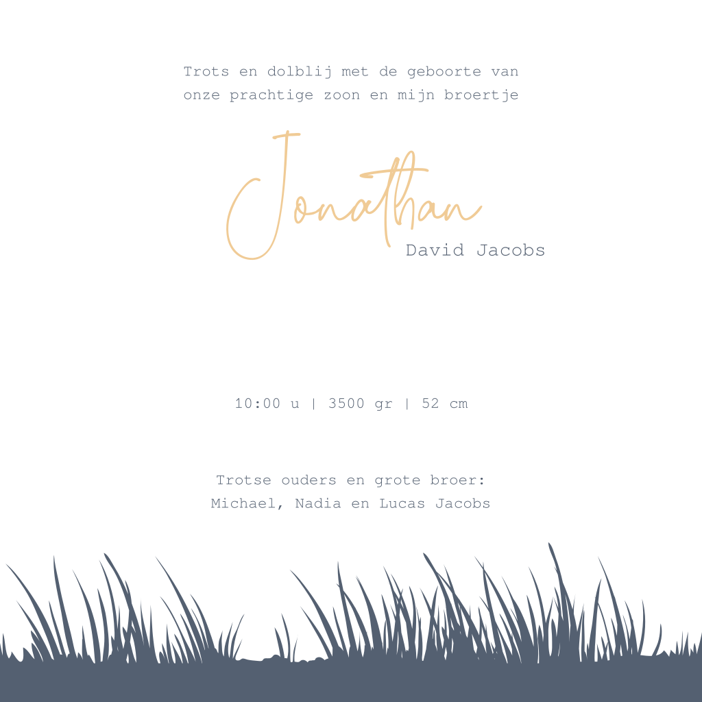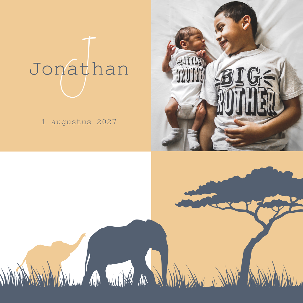 Als je in verwachting bent van een tweede kindje hoort daar natuurlijk ook een speciale aankondiging bij. Het is dan ook leuk om jullie oudste zoon een plekje te geven op de kaart. Dit geboortekaartje laat dat zien met twee olifantjes die symbool staan voor je oudste zoon en zijn broertje. Er is ook nog ruimte voor een eigen foto. Dit maakt jullie geboortekaartje extra persoonlijk. Dit ontwerp kan je gemakkelijk zelf personaliseren in onze handige designtool.