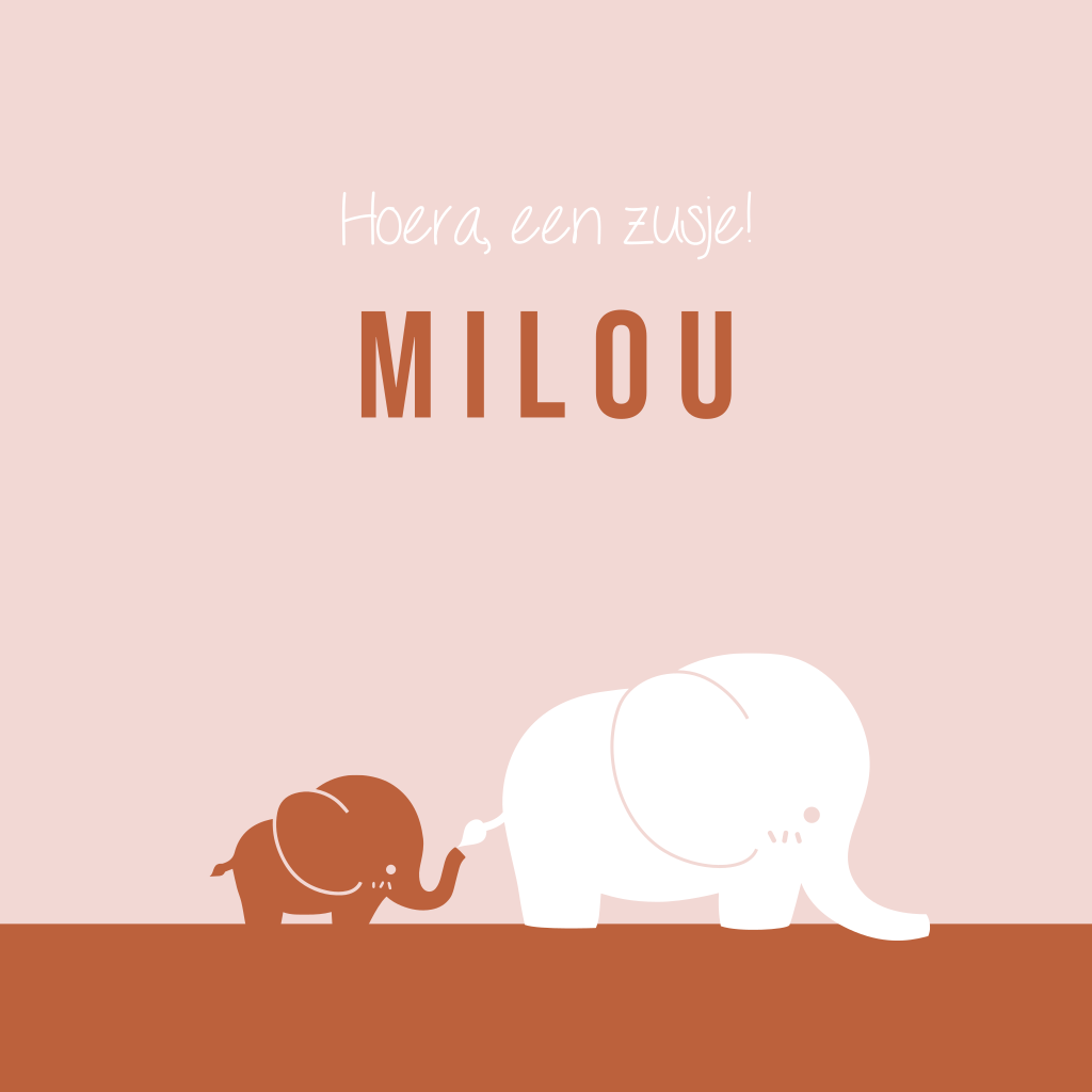 Ben je zwanger en is er een meisje op komst? Geef dan het oudste kindje een leuk plekje op het geboortekaartje zoals bij dit ontwerp met twee olifantjes. De kleinste olifant houdt de staart van haar grote zusje/broertje vast. In onze editor kan je dit ontwerp geheel naar wens personaliseren. Heb je hier hulp bij nodig? Neem dan contact op met onze klantenservice.
