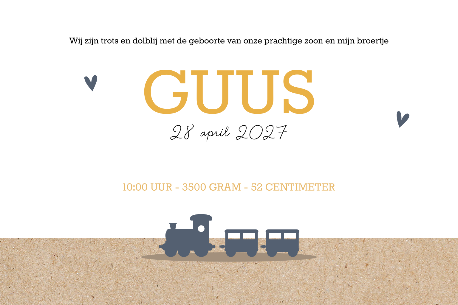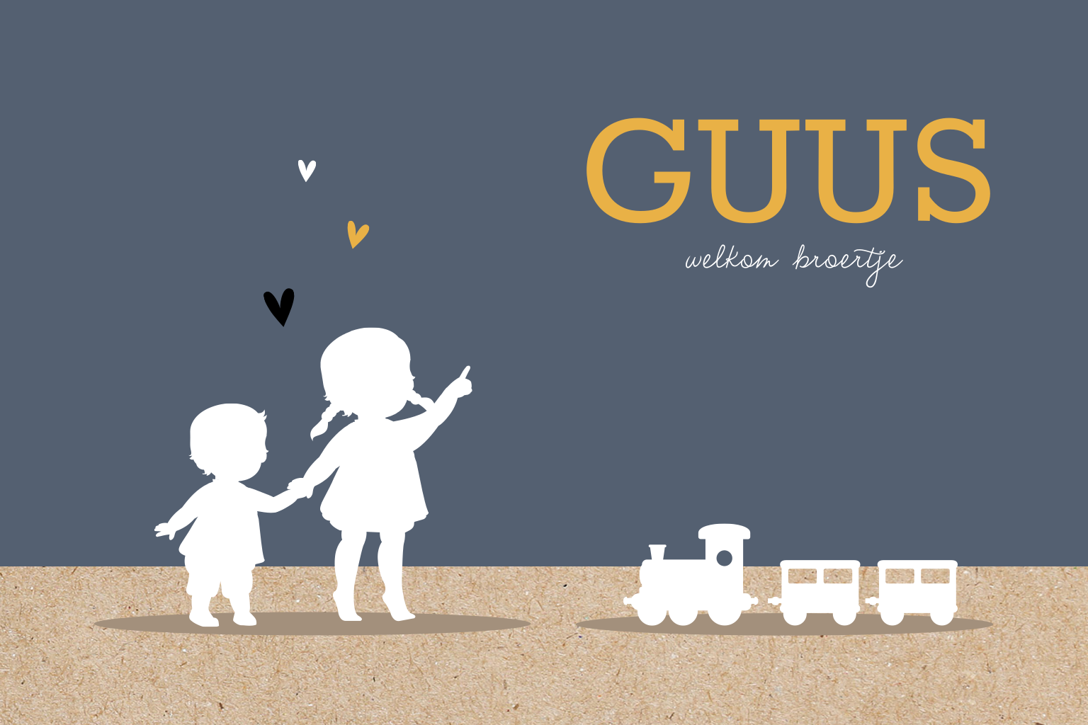 Hip geboortekaartje voor de geboorte van een tweede kindje. Op de voorzijde zie je een lieve silhouet illustratie van een grote zus hand in hand met haar broertje. Trots wijst ze naar zijn naam. Aan de binnenkant van de kaart is genoeg ruimte voor alle gegevens van jullie zoontje en een leuk gedichtje. Pas het ontwerp naar wens aan en bestel een proefdruk.