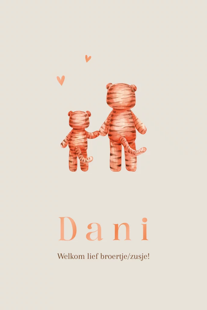 Stijlvol geboortekaartje met een minimalistisch ontwerp van twee oranje tijgertjes, die samen hand in hand staan afgebeeld. De hoogglans naam zorgt voor een moderne en opvallende touch. Dit kaartje is ideaal voor het aankondigen van jullie tweede kindje en kan zowel voor een grote zus of grote broer met baby jongen of meisje. Pas het eenvoudig aan met eigen tekst en details in de editor. Na bewerking kun je een drukproef bestellen om het eindresultaat te beoordelen.