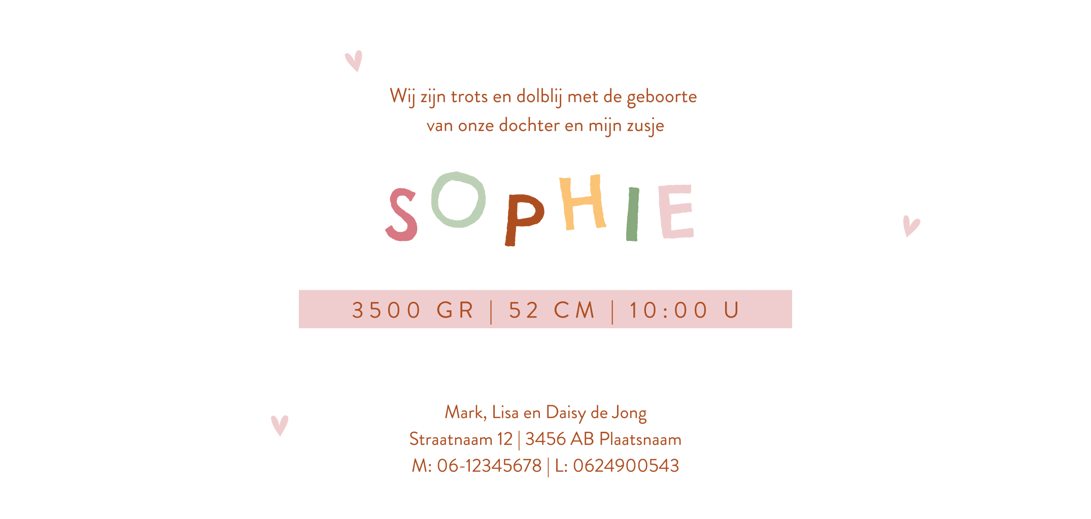 Verwacht je een tweede kindje en ben je op zoek naar een toepasselijk geboortekaartje? Ga dan voor dit liggende ontwerp met getekend landschap, roze wolkjes en twee lieve konijntjes. De twee konijntjes zijn zusjes en houden elkaar handjes vast, lief toch? Aan de binnenzijde van deze dubbele kaart kun je een gedichtje plaatsen. De typografie in verschillende kleuren maakt dit ontwerp tot een vrolijk en speels geheel.